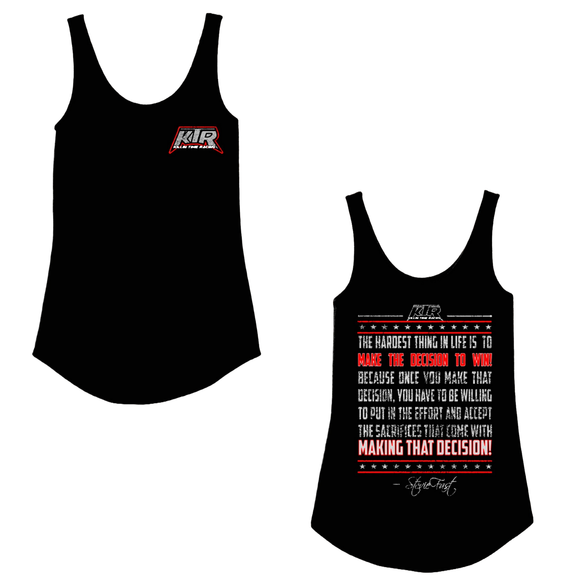 Brand new to the KTR 2024 apparel line up is the Female Tank top Decision to win! ‘The hardest thing in life is to make the decision to win! Because once you have made that decision, you have to be willing to put in the effort and accept the sacrifices that come with making that decision!