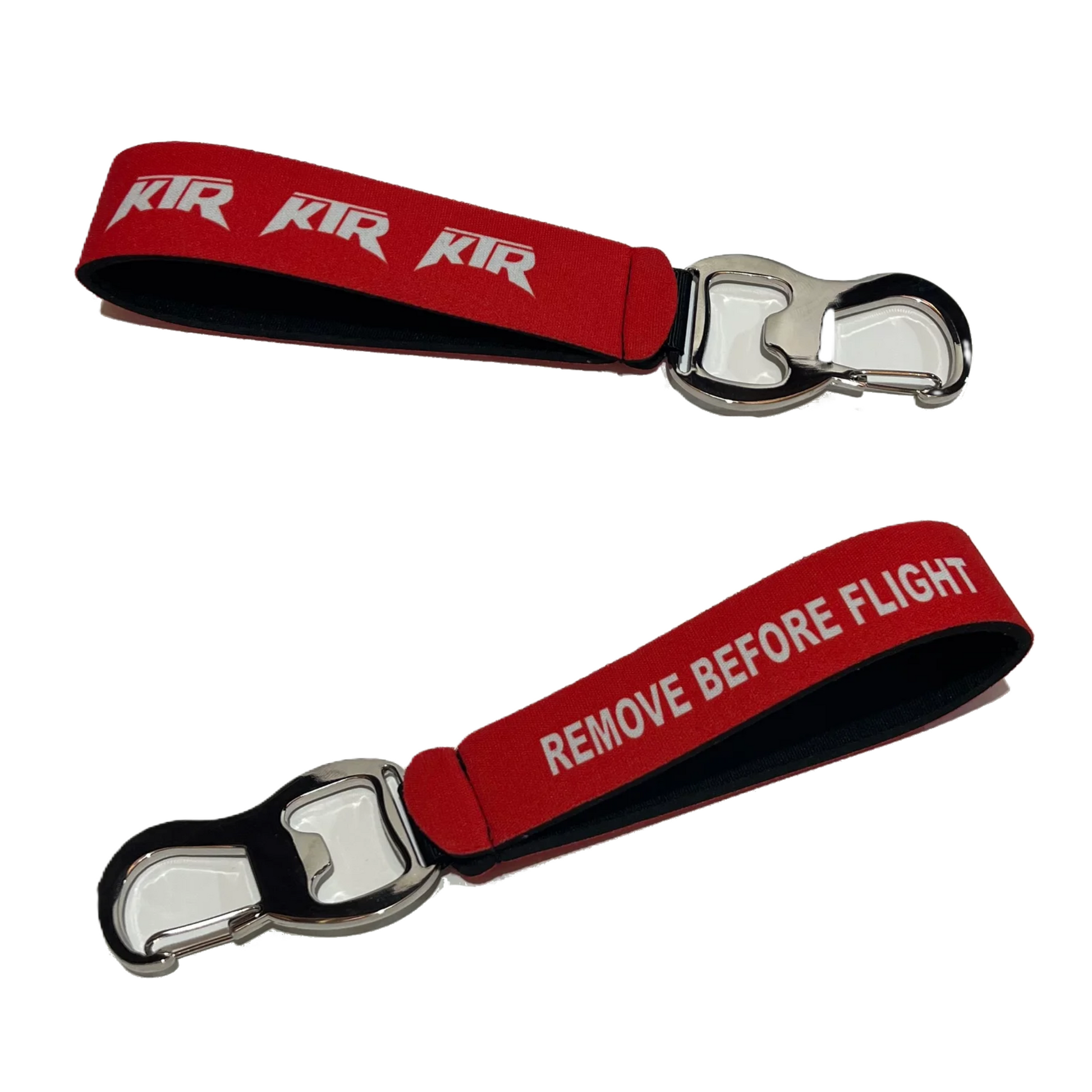 This neoprene wristband and bottle opener features triple KTR logo on one side and remove before flight on the revers . The comfortable neoprene wristband keyring clip is great for your keys and doubles as a bottle opener. Clip it to your bag, belt loop, or wear it as a wristband.