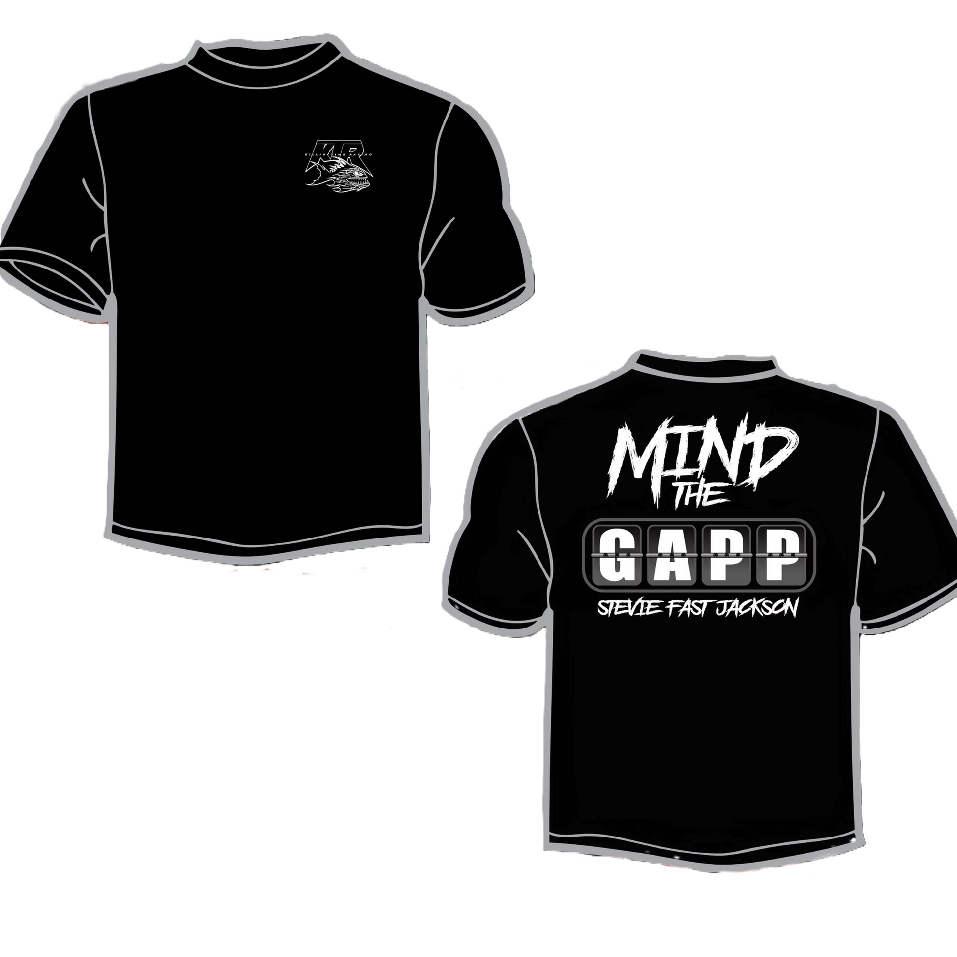 THESE BLACK GILDAN DRY BLEND SHIRTS FEATURE Stevie Fast new slogan: MIND THE GAPP!