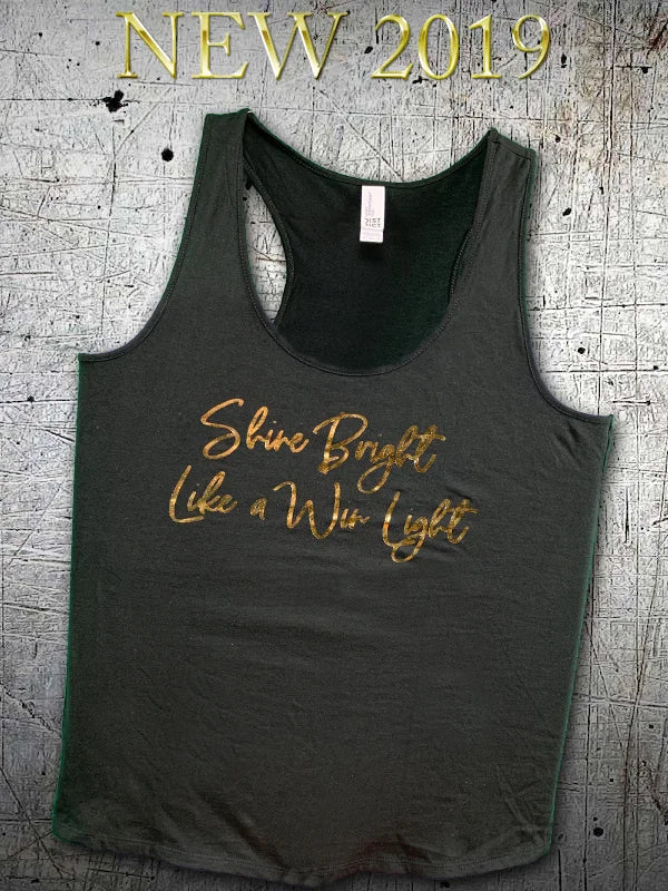 KTR apparel line up is the Female Tank top (Shine Bright Like a Win Light) on a black tank top with gold letters.